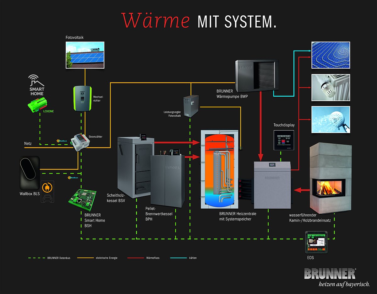 Das Zusemmenspiel, Holzofen - Wärmepumpe - Photovoltaikanlage gelingt mit der BHZ von Brunner Perfekt.